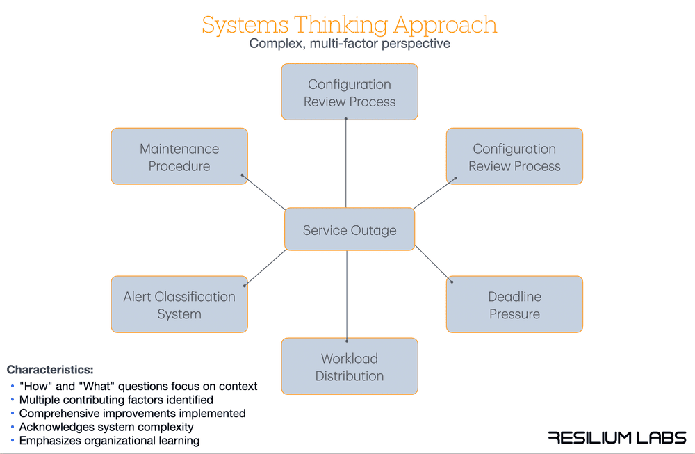 The key difference wasn't just in asking better questions. The approach fundamentally recognized that incidents emerge from complex interactions between people, technology, and organizational factors, rather than from a single cause or person's mistake.
