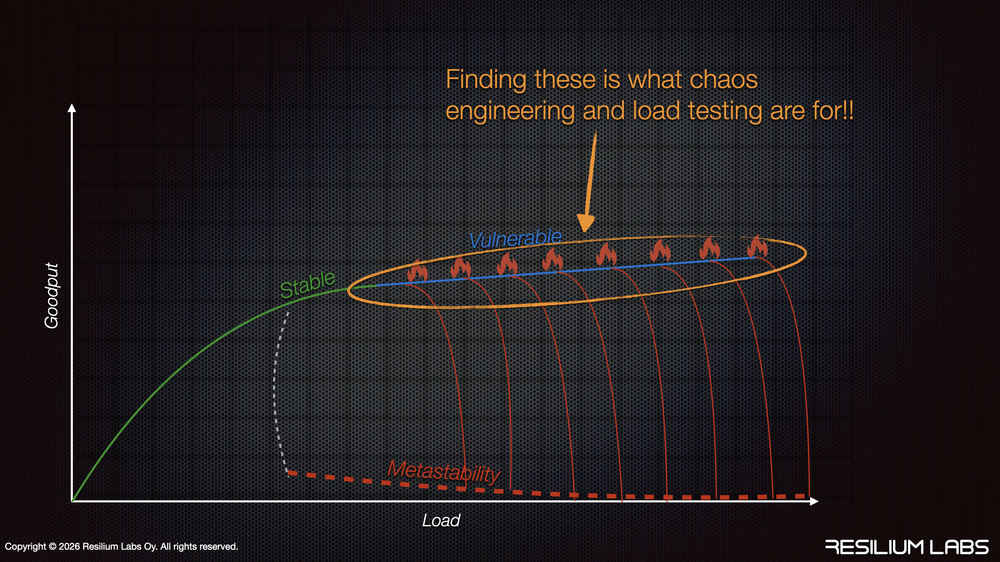 That combination is exactly what production delivers. And that vulnerable region is exactly where you need to run your experiments to find the triggers that will collapse your system into metastability.