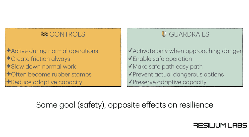 The path forward requires consciously auditing our practices through a controls vs guardrails lens. Where are we creating friction during normal operations when we should be creating safety boundaries? Where are we demanding compliance when we should be enabling adaptation?