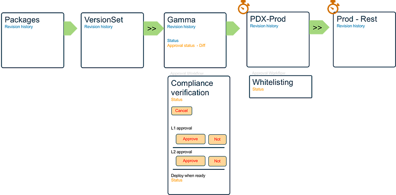 A pipeline consists of any number of stages. The example above starts by building packages into version sets, then flows into Gamma stage, then one-box production stage, and finally, full production stage. Each arrow is a promotion step that serves as a validation gate before the release goes to the next stage.